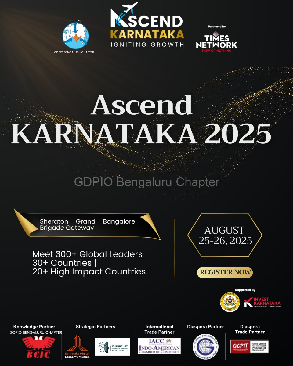 - Karnataka – A GLOBAL POWER HOUSEASCEND KARNATAKA Conclave Highlights Ascend Karnataka – A Global Infrastructure and Investment Conclave, 2025, hosted by GDPIO Bangalore Chapter in partnership with the Times Network, is a strategic platform advancing Karnataka’s trillion-dollar vision by uniting global industry leaders, Indian Diaspora and policymakers
